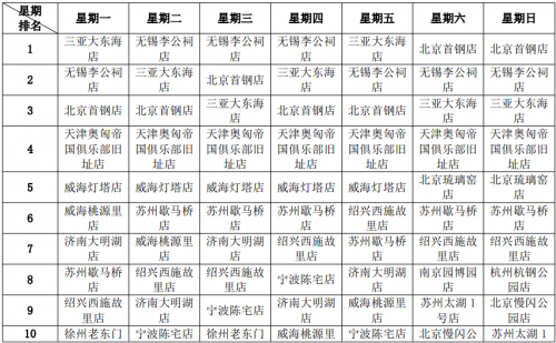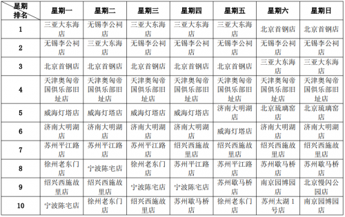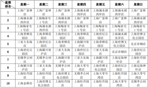 (4)营业额结构点评:无独有偶,营业额每周7天的TOP10,不仅全国门店与上海门店重叠,而且排名与客流每周7天的TOP10完全一样,它表明,虽然门店地处上海远郊,但这座超大城市的消费能力仍然遥遥领先。据统计,市外门店的日度营业额榜首,其业绩体量可达全部门店总冠军的50%。